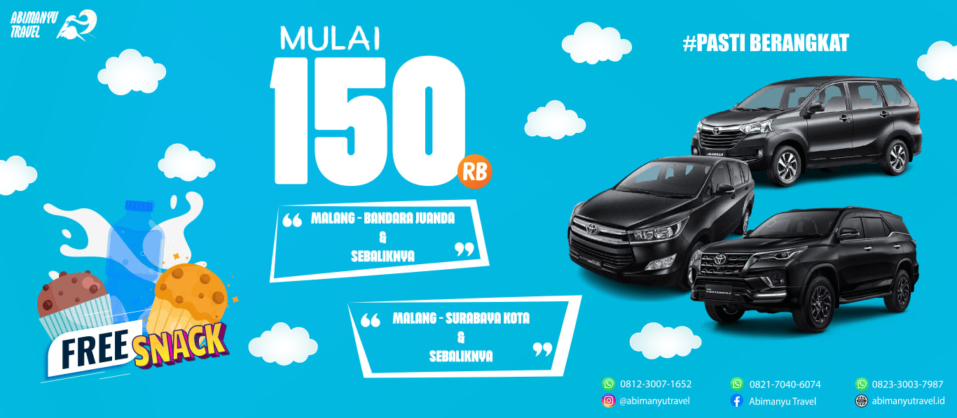 Travel Surabaya Malang - Pesan travel dari Surabaya ke Malang kapan saja dan dari mana saja dengan Abimanyu. Tak perlu repot lagi, sekarang Anda bisa beli tiket dengan mudah dari mana saja. • Telp/WhatsApp: 081230071652 / (0341)-3041382 • Layanan 24/7 • Mobil Innova Reborn (Max. 5 Penumpang) & All New Avanza / Xenia (Max. 5 Penumpang). Mulai dari info jadwal travel, harga tiket, hingga mobil, foto dan fasilitasnya, semuanya bisa ditemukan di Abimanyu untuk membantu Anda mendapatkan informasi dan pesan travel jurusan Surabaya ke Malang dengan perjalanan berkualitas terbaik.